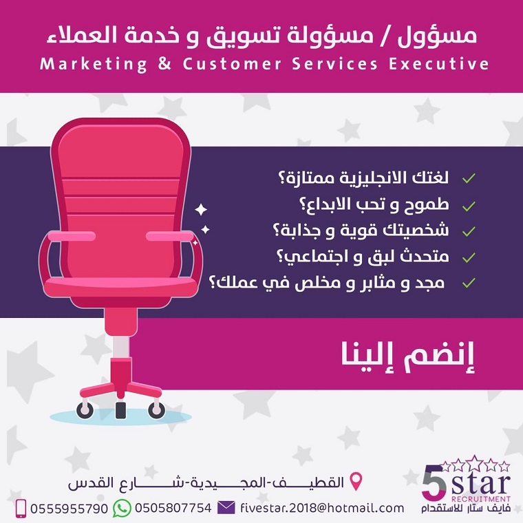 يعلن مكتب فايف ستار للاستقدام عن وجود وظيفة شاغر بمسمى «مسؤول / مسؤولة تسويق وخدمة العملاء».