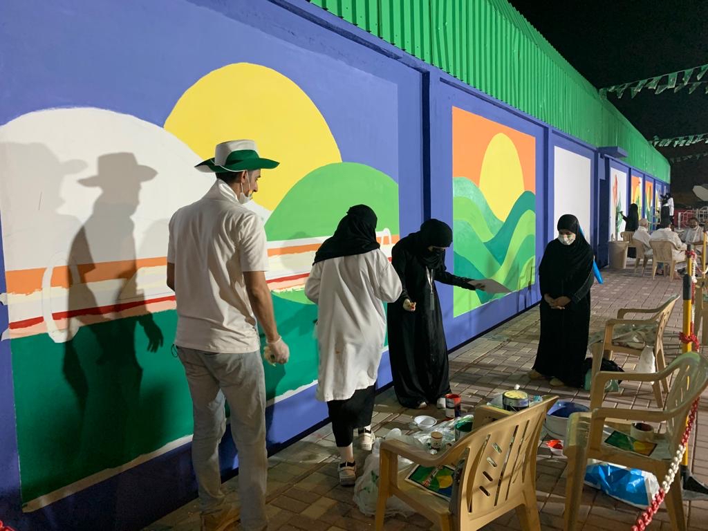 وشارك في رسم هذه اللوحة الجدارية عدد من الفنانين التشكيليين المعروفين بقيادة فريق «لنا إبداع»، ويؤدي دوره بشكل رائع، وتخلل هذه الفعالية بعض الأركان المتوافقة مع اليوم الوطني عبارة عن صور، كما وجه شكره لجميع من ساهم بالمشاركة في هذه الفعالية.