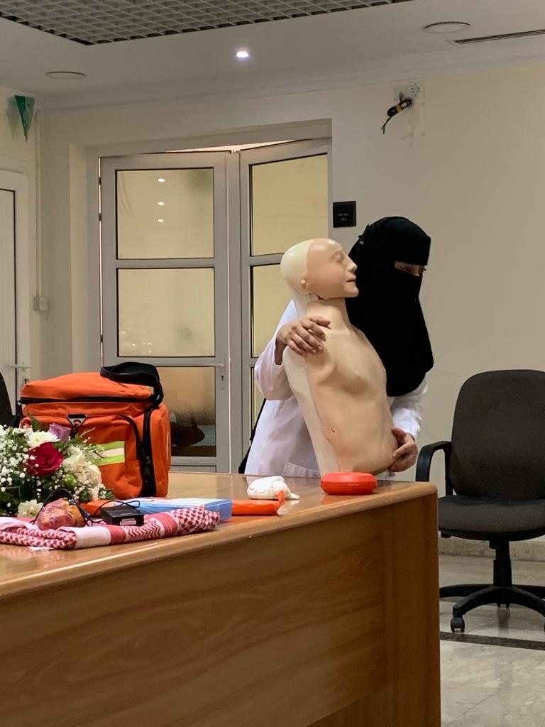 وتضمنت الدورة التي قدمها المدربان المعتمدان فيصل الزهران، وشريفة المبارك، على مقدمة عن أهمية الإسعافات الأولية، والتعرف على الرقم الإسعافي وكيفية طلب الخدمة الإسعافية في الحالات الطارئة، وطريقة استخدام برنامج أسعفني، إضافة إلى أهمية الرعاية القلبية ”الإنعاش القلبي الرئوي للبالغ والطفل الرضيع“، مع كيفية استخدام جهاز مزيل الرجفان البطيني.