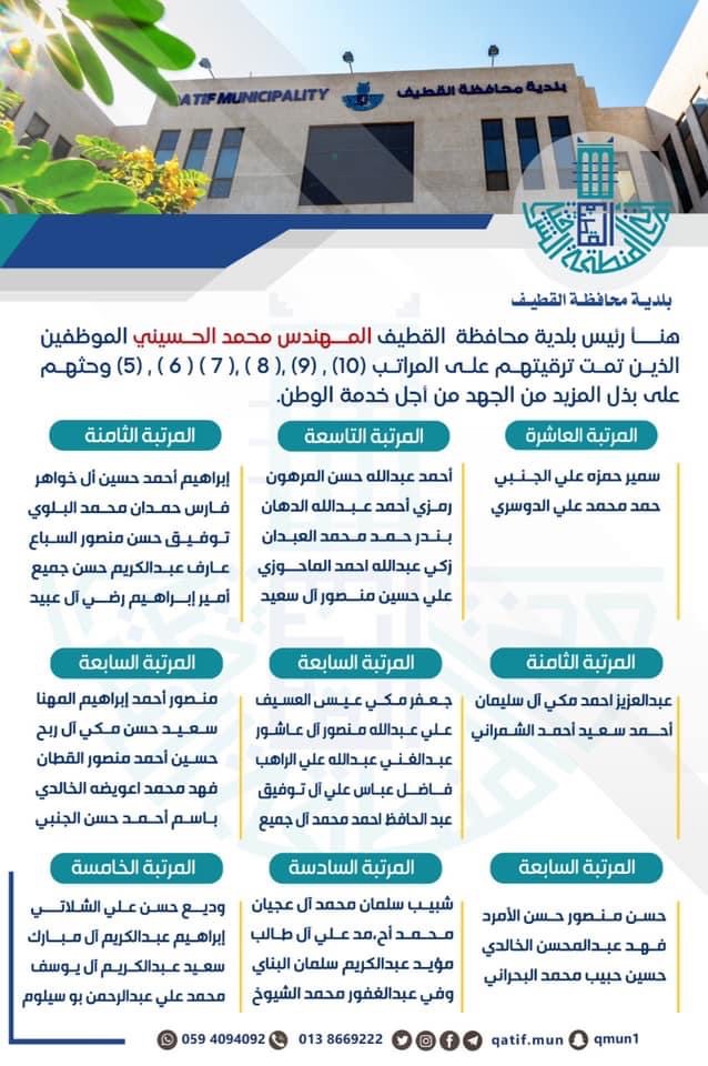 أصدر رئيس بلدية محافظة القطيف المهندس محمد الحسيني قرارا بترقية 35 موظفًا من المرتبة الخامسة إلى المرتبة العاشرة.