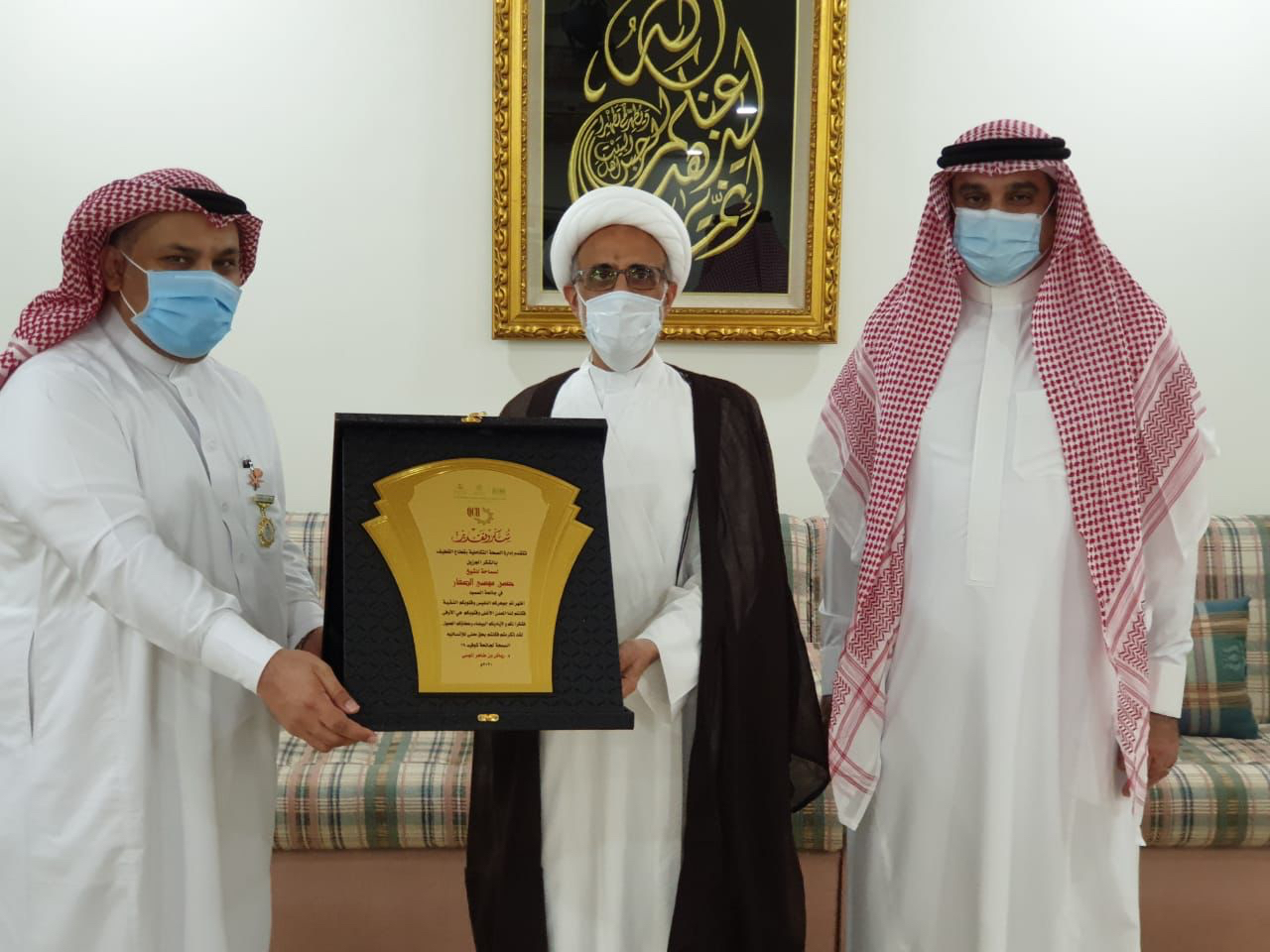 نظير المشاركة المجتمعية المميزة في دعم الخدمات الصحية خلال جائحة كورونا، رئيس شبكة القطيف الصحية وبحضور مدير الخدمات الطبية يقدم الشكر لسماحة الشيخ حسن الصفار على دعمه المستمر.