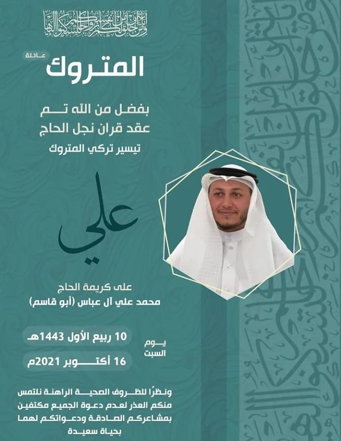 احتفلت عائلة المتروك وآل عباس في سيهات مساء يوم السبت بعقد قران الشاب علي تيسير تركي المتروك على كريمة الحاج محمد علي آل عباس «أبو قاسم» وسط فرحة الأهل والأصدقاء ومحبي العريسين.