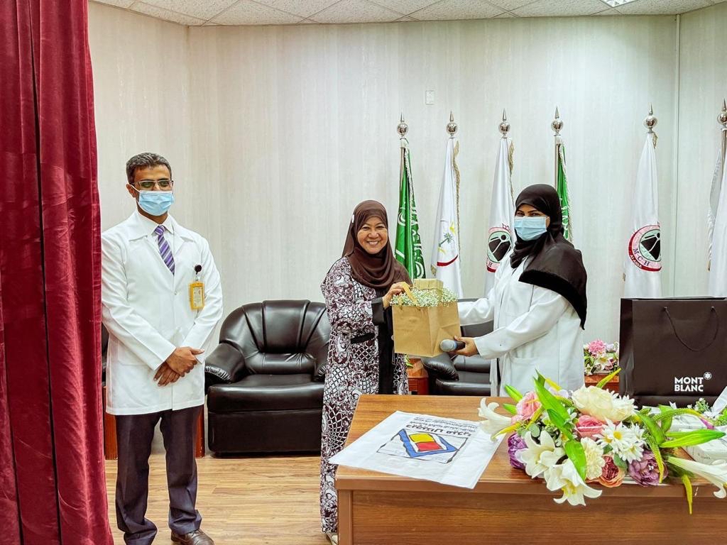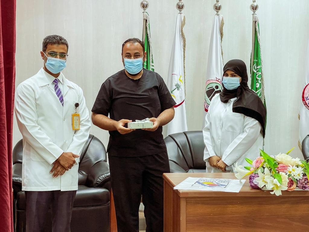 وكذلك تم تكريم د. محمد الناصر، رئيس الأطباء المقيمين، وذلك تقديرا لجهوده في تنسيق مناوبات الأطباء المقيمين، وتنظيم الأمور المرتبطة بهم، ومساعدتهم في حل ما يواجهون من مصاعب.