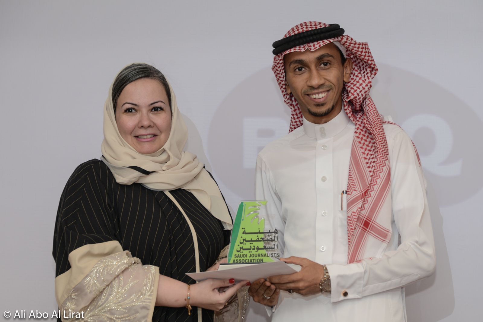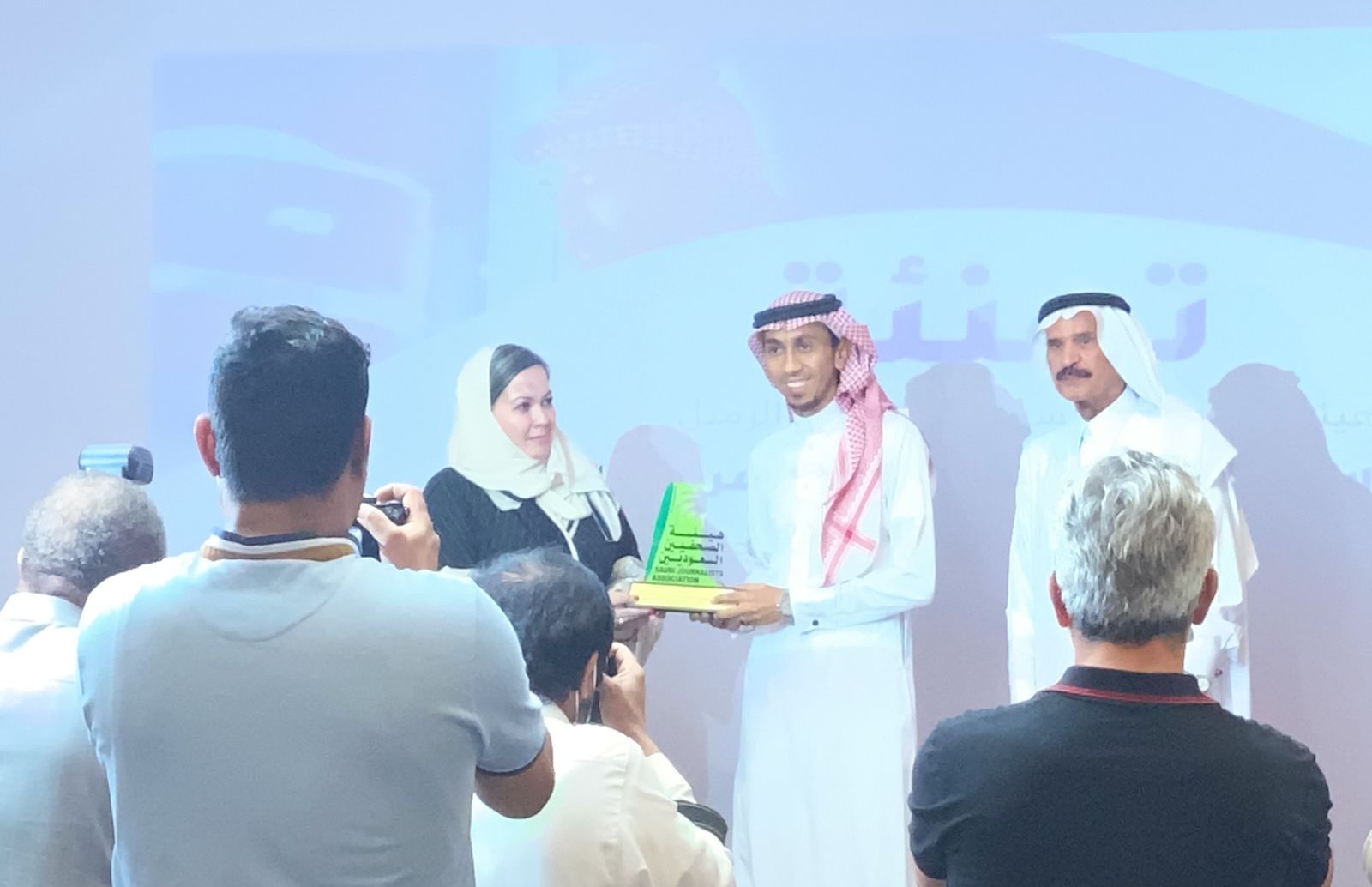 وسلمت الجائزة إسراء عسيري، الرئيس التنفيذي للإعلام المرئي والمسموع، بحضور خالد المالك رئيس هيئة الصحفيين، وذلك ضمن حفل تدشين الصالون الاعلامي وتكريم الفائزين بمسابقة اليوم الوطني 91.