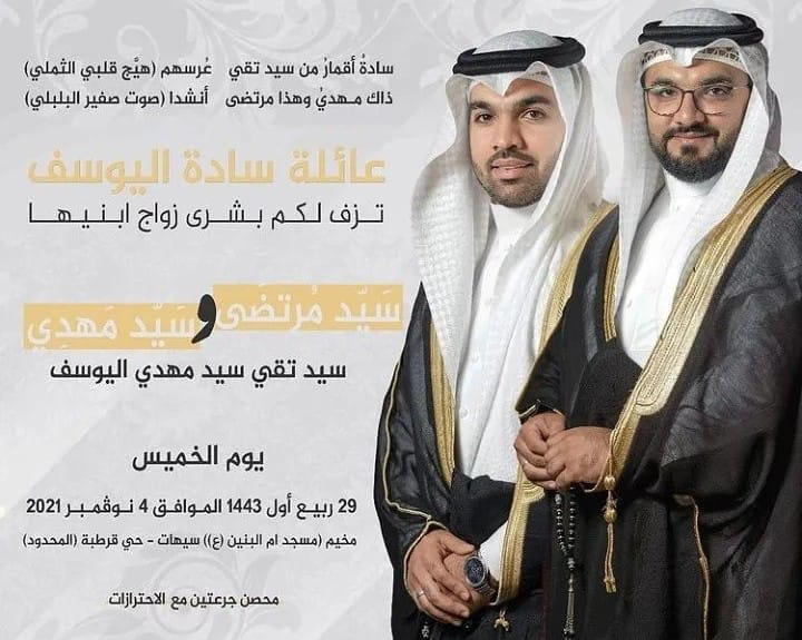 تحتفل عائلة اليوسف في سيهات مساء يوم الخميس بزفاف السيد مرتضى والسيد مهدي ابناء السيد تقي السيد مهدي اليوسف في مخيم مسجد أم البنين حي قرطبة وسط فرحة الأهل والأصدقاء ومحبي العريسين.