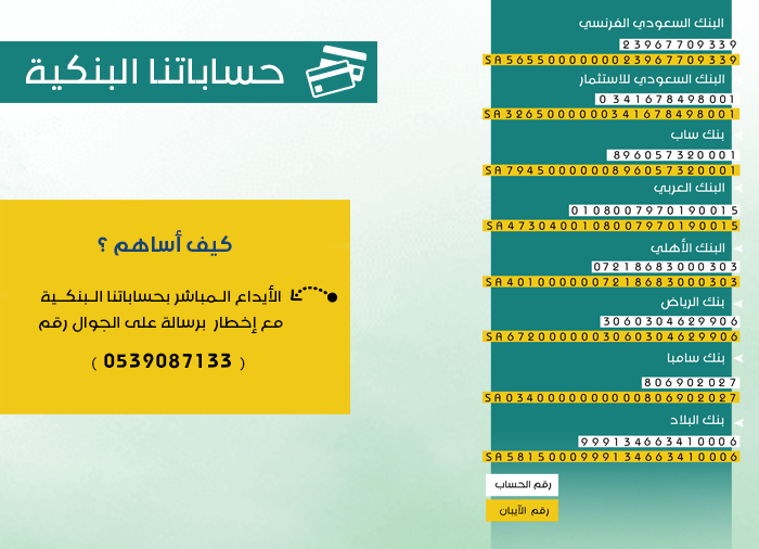 للمساهمة في دعم اللجنة يمكنك التبرع عبر الحسابات البنكية للجمعية.