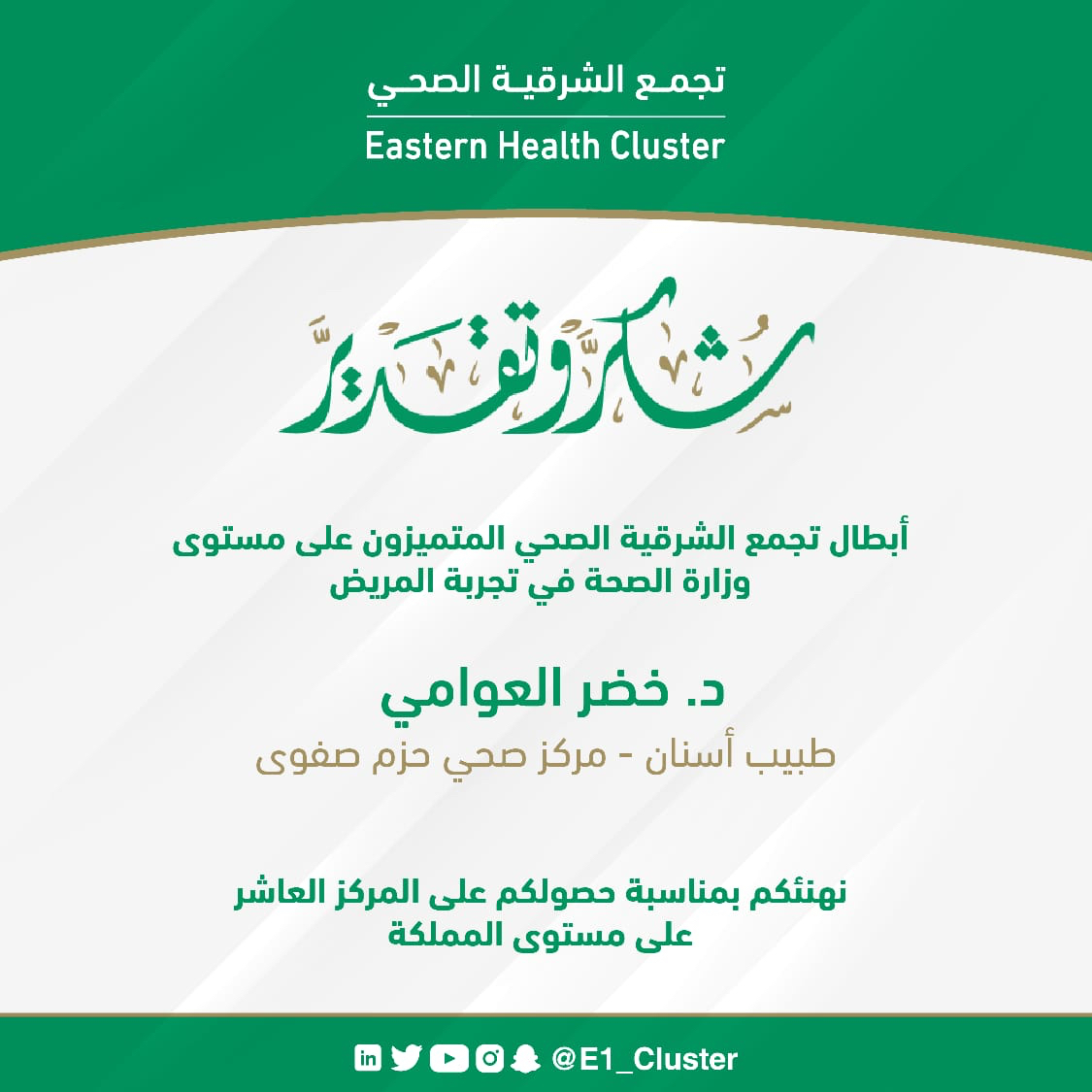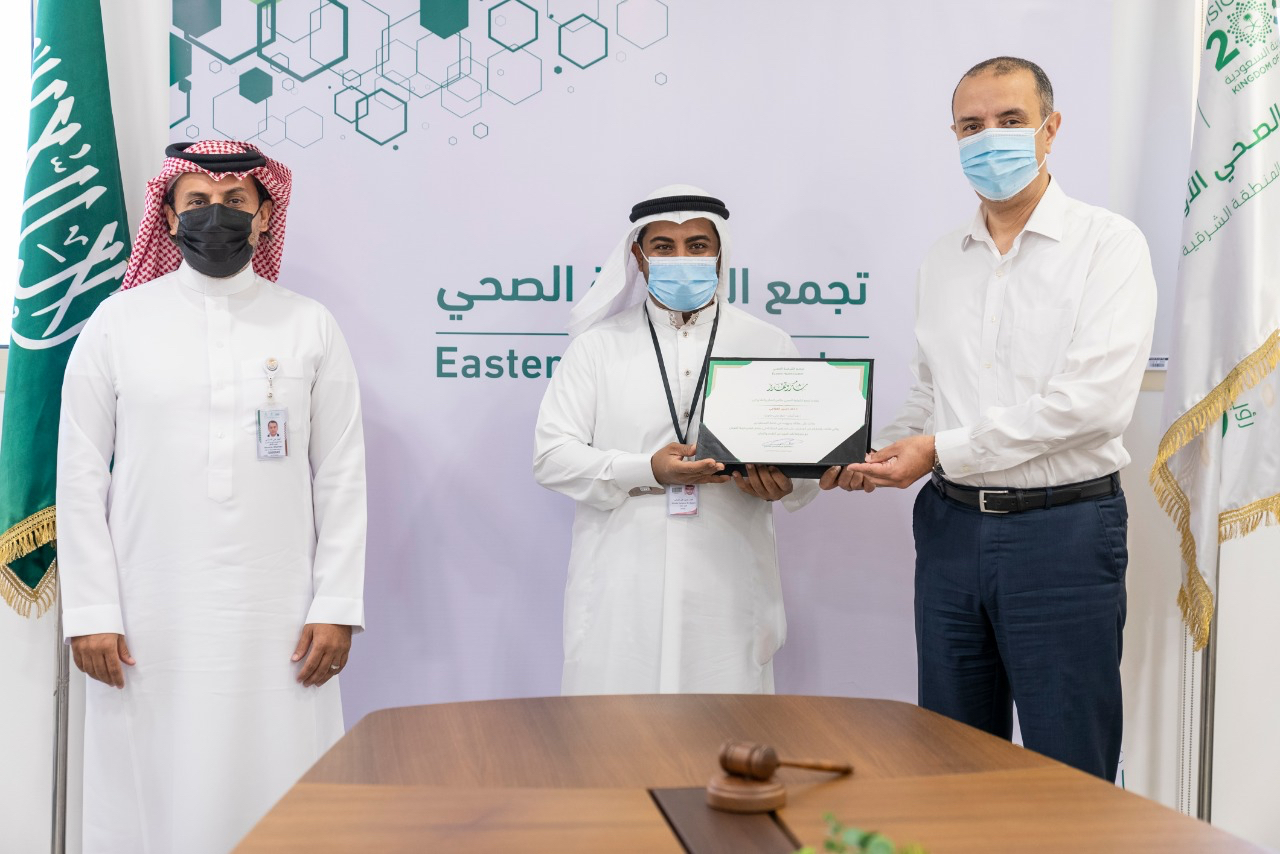 كرم تجمع الشرقية الصحي الدكتور خضر حسين علي العوامي طبيب الأسنان بمركز صحي حزم في صفوى بشهادة شكر وتقدير نظير حصوله على المركز العاشر على مستوى المملكة في تجربة المريض.