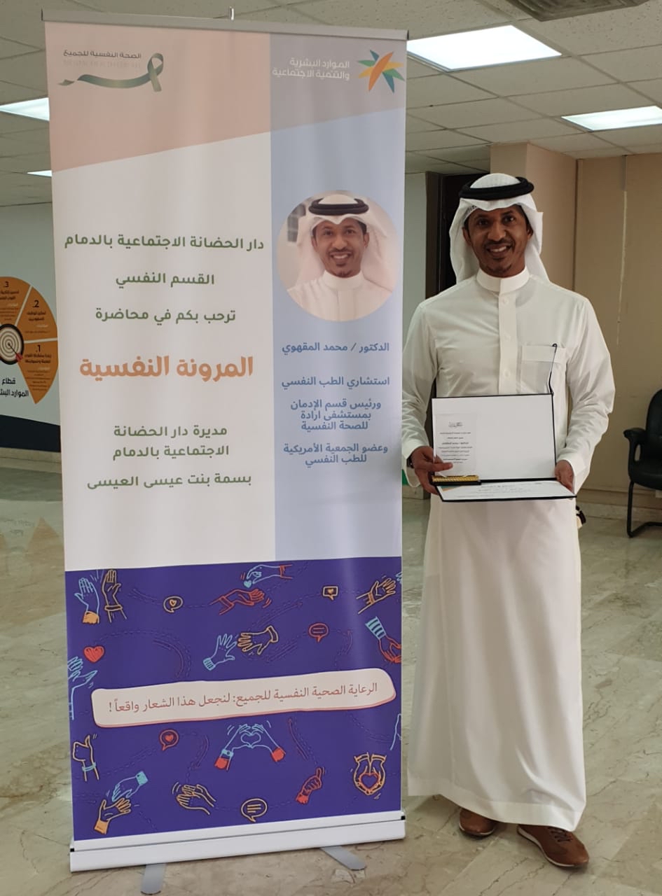 وألقى المحاضرة الدكتور محمد المقهوي استشاري الطب النفسي المدير التنفيذي للخدمات الطبية والاكلينيكية بمجمع ارادة بالدمام، وعضو الجمعية الأمريكية للطب النفسي، الذي تحدث عن مفهوم المرونة النفسية وفوائدها، والعادات التي تساعد على تحسين المزاج وهدوء الأعصاب ومعالجة المشكلات وكيف تلعب دوراً هاماً في تحديد مدى قدرة الفرد على التكيف مع الصعوبات والمواقف الضاغطة.