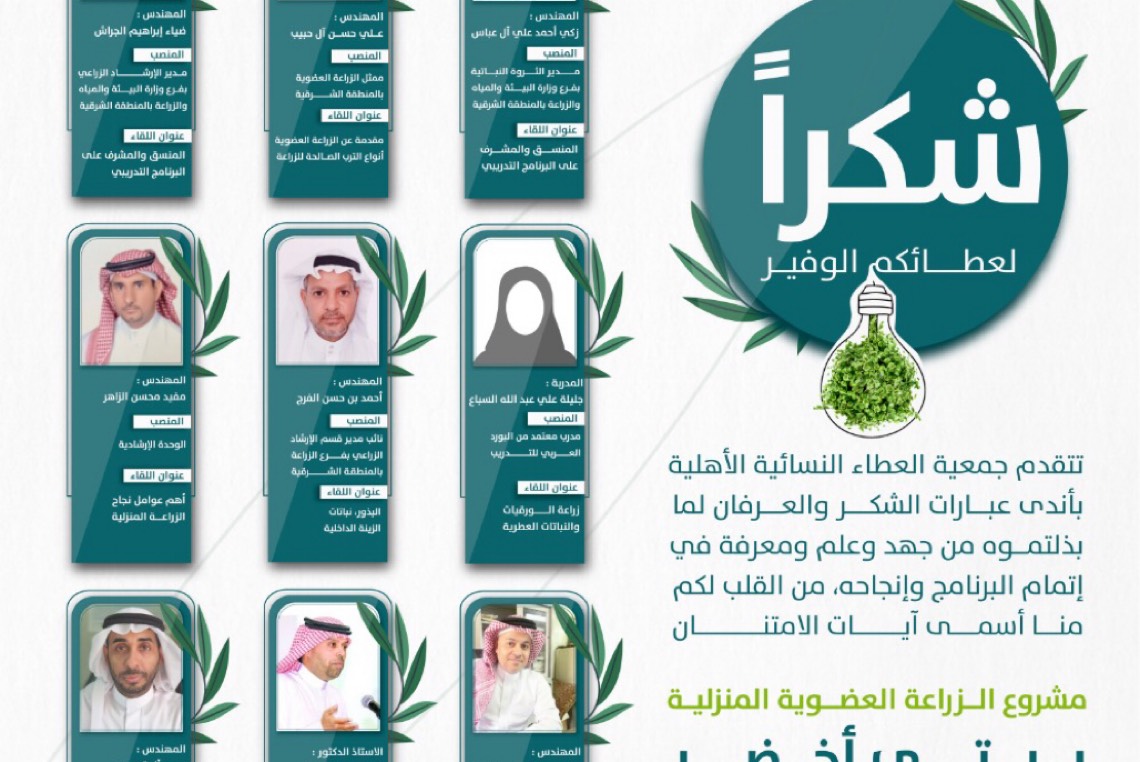 من ناحيته، قدم مدير الثروة النباتية بفرع وزارة البيئة والمياه والزراعة بالمنطقة الشرقية المهندس زكي آل عباس 4 باقات من كلمات الشكر والتقدير، ووجه باقة الشكر الأولى إلى القائمين على المشروع من إدارة العطاء في مقدمتهم الدكتورة أحلام القطري، ودلال العوامي ومشرفة قسم البرامج سناء الحداد، نظير التعاون المثمر الذي تم من خلاله تحقيق المستهدفات.