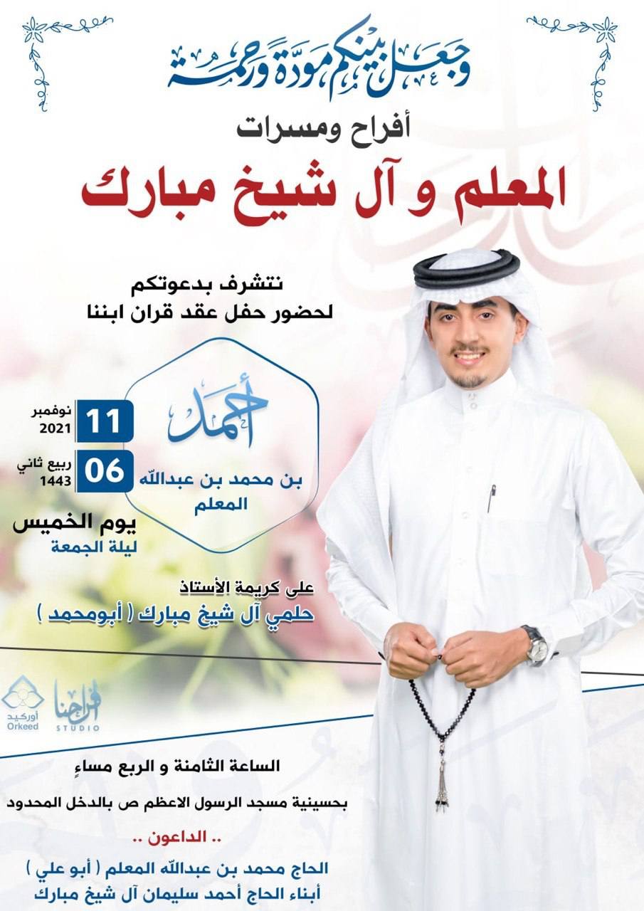 احتفلت عائلة المعلم وآل شيخ مبارك في صفوى مساء يوم الخميس بعقد قران الشاب أحمد محمد عبدالله المعلم على كريمة الحاج حلمي آل شيخ مبارك في حسينية مسجد الرسول الأعظم بالدخل المحدود وسط فرحة الأهل والأصدقاء ومحبي العريسين.