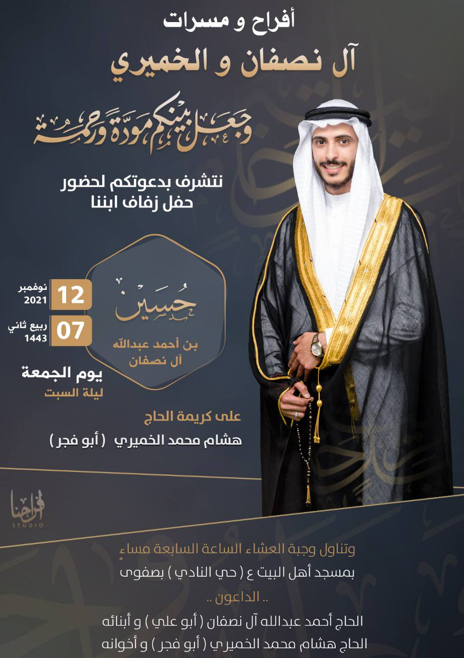 احتفلت عائلة آل نصفان والخميري في صفوى مساء يوم الجمعة بزفاف الشاب حسين أحمد عبدالله آل نصفان على كريمة الحاج هشام محمد الخميري وسط فرحة الأهل والأصدقاء ومحبي العريسين.