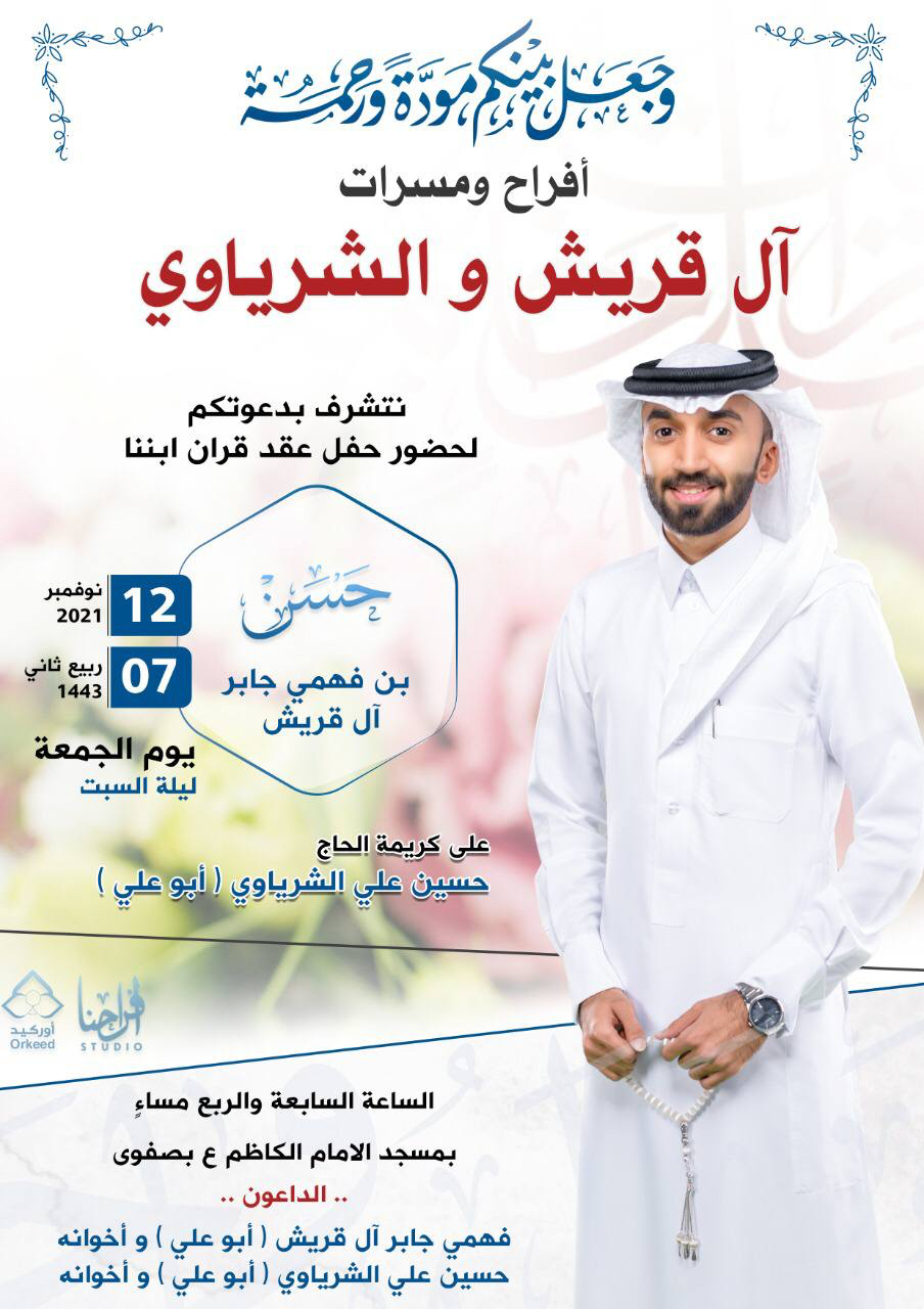 احتفلت عائلة آل قريش والشرياوي في صفوى مساء يوم الجمعة بعقد قران الشاب حسن فهمي جابر آل قريش على كريمة الحاج حسين علي الشرياوي وسط فرحة الأهل والأصدقاء ومحبي العريسين.