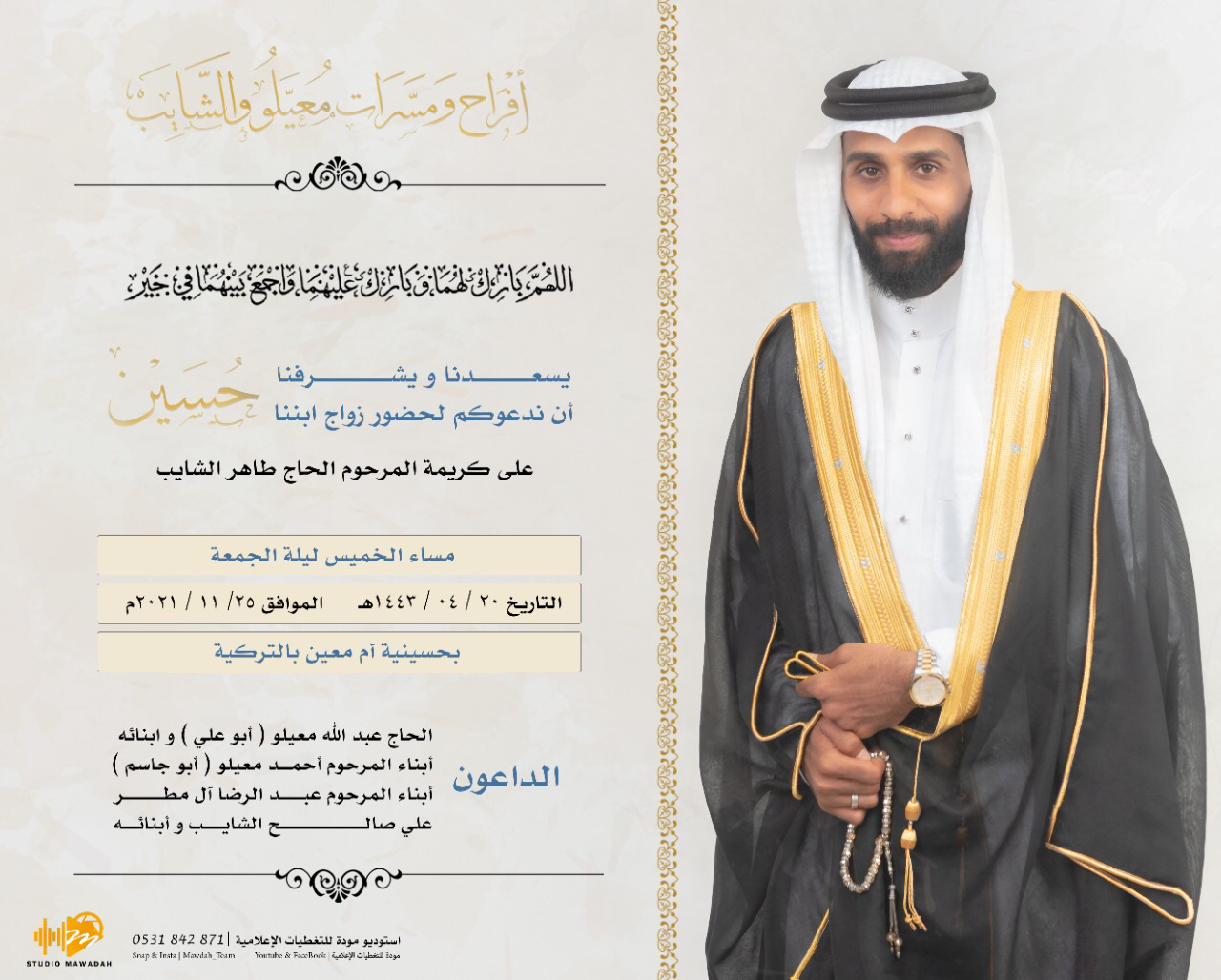 تحتفل عائلة معيلو والشايب في تاروت مساء يوم الخميس بزفاف الشاب حسين عبدالله معيلو على كريمة المرحوم طاهر الشايب في حسينية أم معين بحي التركيا وسط فرحة الأهل والأصدقاء ومحبي العريسين.