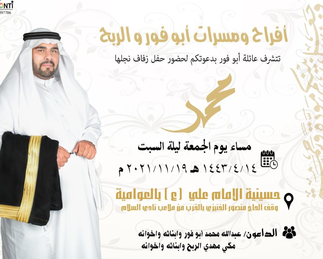 تحتفل عائلة أبو فور والربح في العوامية مساء يوم الجمعة بزفاف الشاب محمد عبدالله محمد أبو فور على كريمة الحاج مكي مهدي الربح في حسينية الإمام علي وسط فرحة الأهل والأصدقاء ومحبي العريسين.
