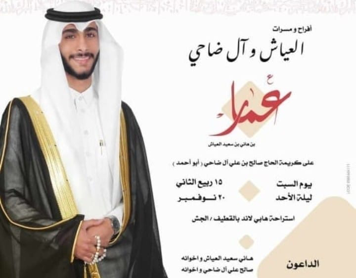 تحتفل عائلة العياش وآل ضاحي في الجش مساء يوم السبت بزفاف الشاب عمار هاني سعيد العياش على كريمة الحاج صالح علي آل ضاحي وسط فرحة الأهل والأصدقاء ومحبي العريسين.