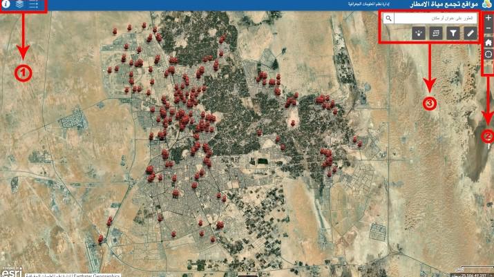 وأضاف أنه ومن خلال خريطة التطبيق يتم الاطلاع على الطبقات ونسبة تجمع المياه، كماتم تفعيل اداة القياس لحساب ”المسافة، المساحة، خطوط الطول، دوائر العرض ”، بالإضافة الى الأدوات الأخرى المتعلقة ب «البحث المخصص، الاحداثيات، المشاركة، الموقع».