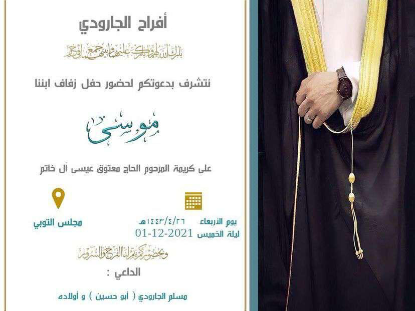 تحتفل عائلة الجارودي وآل خاتم في التوبي مساء يوم الأربعاء بزفاف الشاب موسى مسلم الجارودي على كريمة الحاج معتوق عيسى آل خاتم في مجلس التوبي وسط فرحة الأهل والأصدقاء ومحبي العريسين.