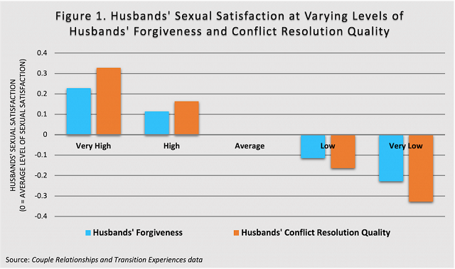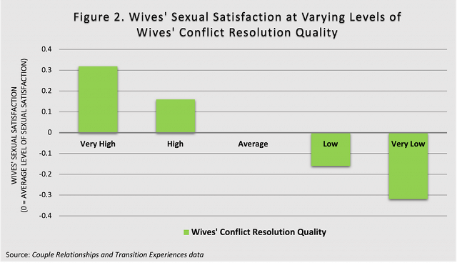 السردية هي نفس السردية لكل من الأزواج والزوجات: الذين يتمتعون بمستويات عالية من جودة حل النزاع يحصلون على مستويات من الرضا الجنسي أعلى من المتوسط، في حين يحصل ذوي مستويات جودة حل النزاع المنخفضة على مستويات من الرضا الجنسي أقل من المتوسط.