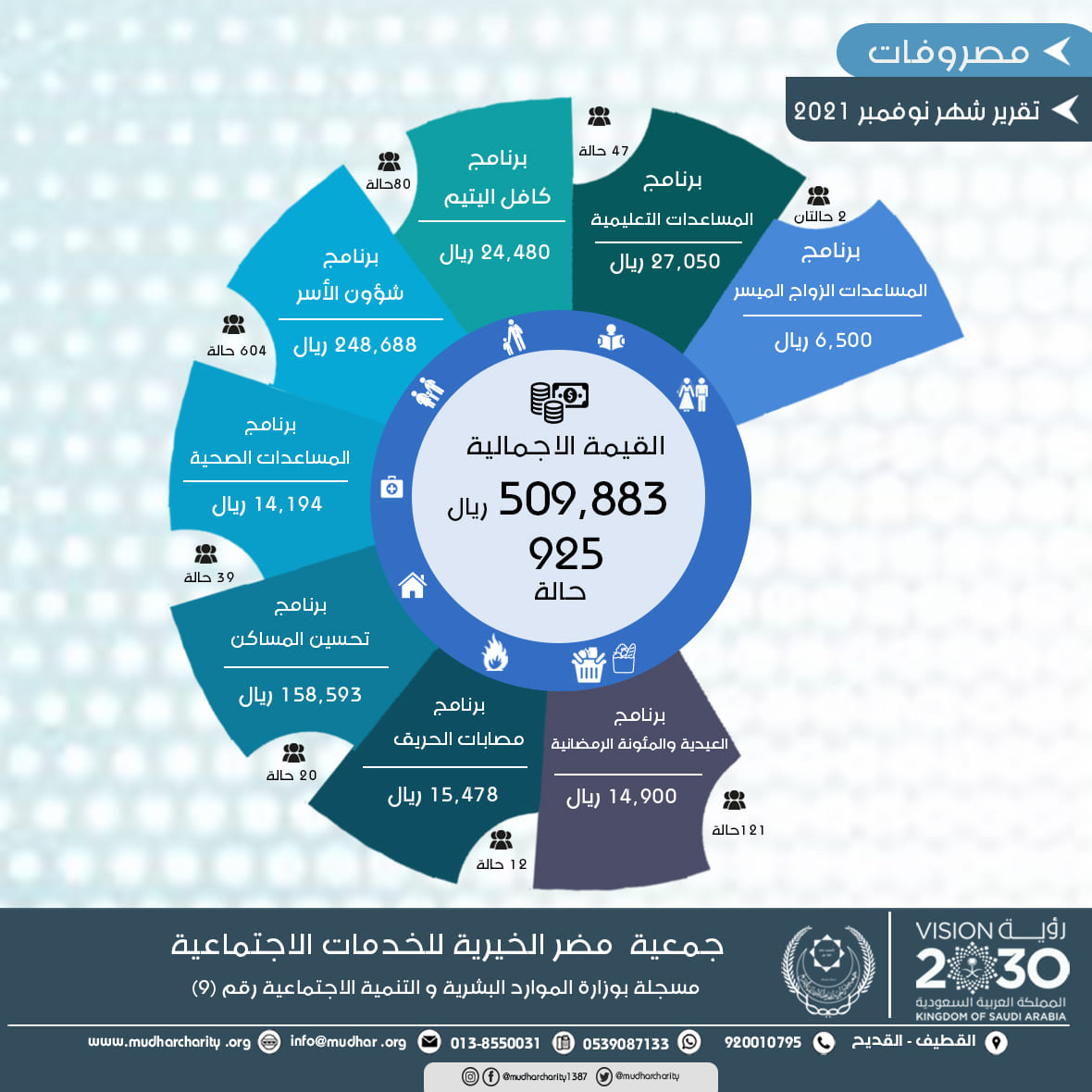 كشف التقرير المالي الصادر عن الإدراة المالية بجمعية مضر الخيرية أن اجمالي مصروفات البرامج التنموية والخدمية فيشهر نوفمبر 2021 م بلغت 509,883 ريالا، صُرفت على 925 حالة من الأسر المتعففة التي ترعاها الجمعية.