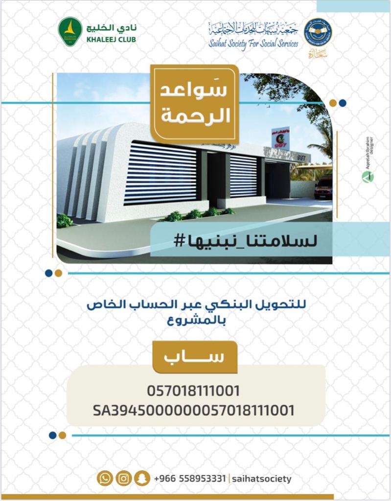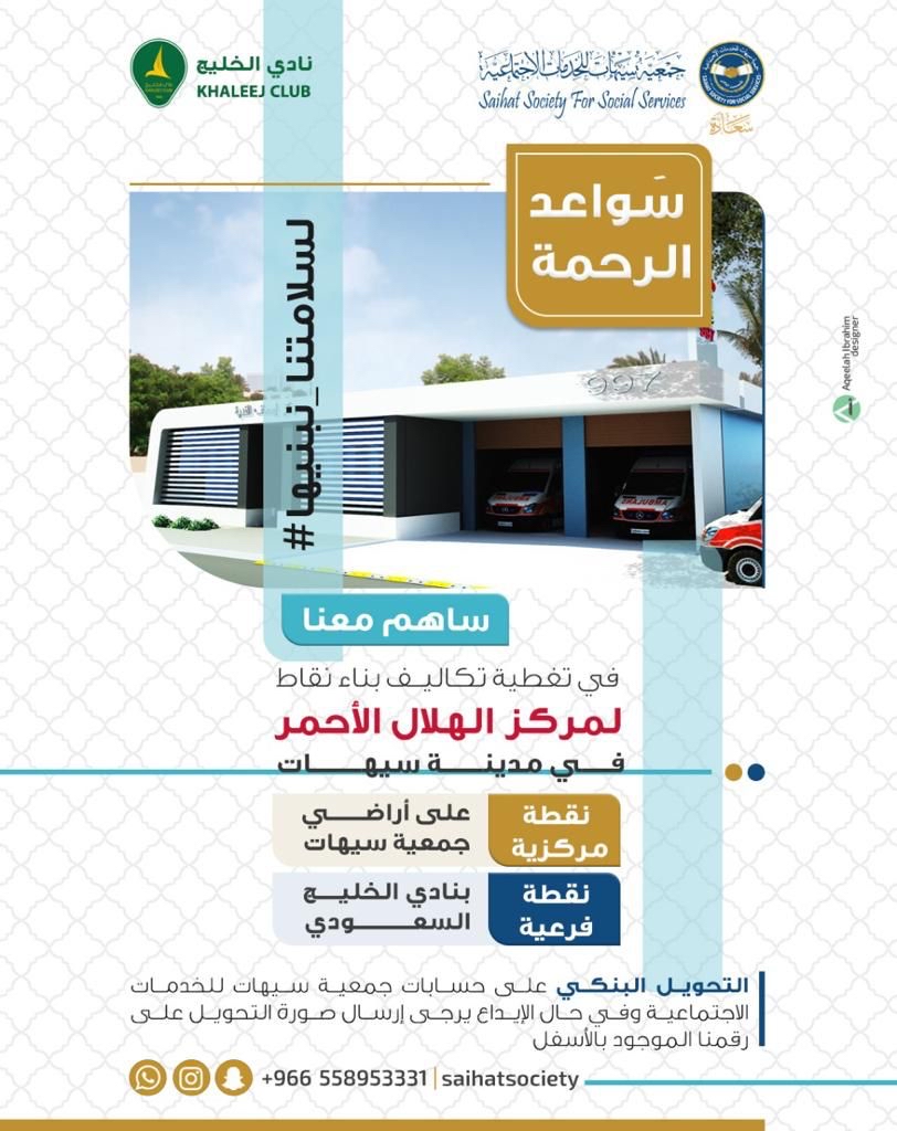 أطلقت جمعية سيهات للخدمات الاجتماعية، حملة ”لسلامتنا نبنيها“، بالتعاون مع وحدة المسؤولية الاجتماعية بنادي الخليج لدعم مشروع إنشاء نقطتي اسعاف في مدينة سيهات.