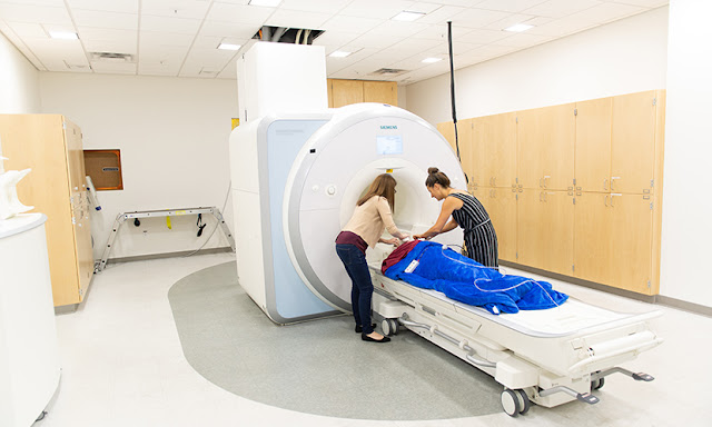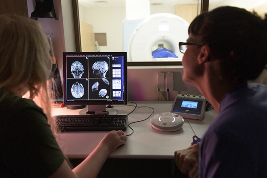 تحضر هانا رومي Hanga Rome «إلى اليمين» ونيكول فارجا Farga أحد المشاركين في الدراسة لإجراء تصوير للدماغ بالرنين المغناطيسي الوظيفي. المصدر: فيفيان أباجيو Vivian Abagiu