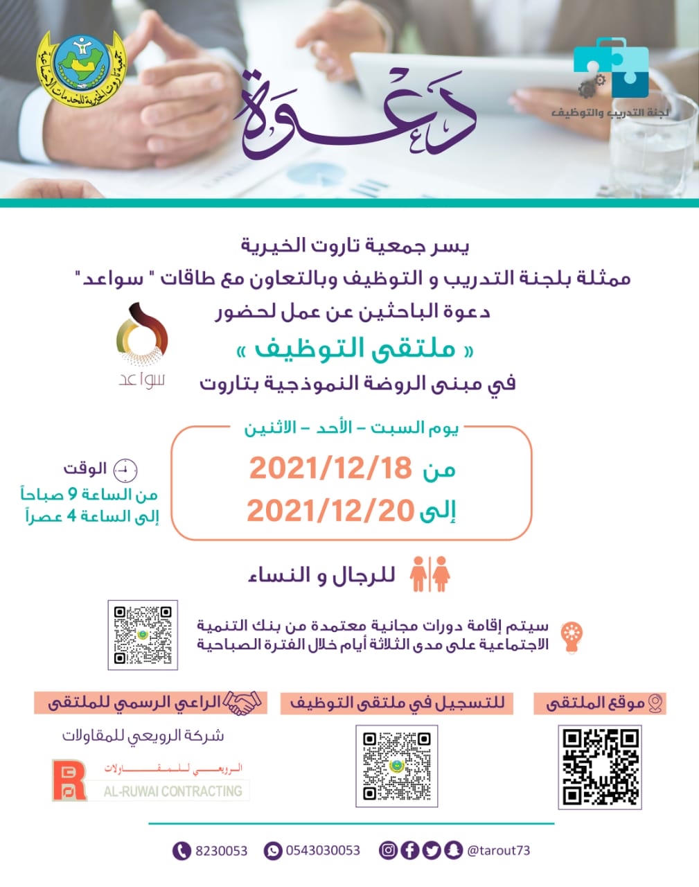 تُنظّم لجنة التدريب والتوظيف بجمعية تاروت الخيرية؛ وبالتعاون مع طاقات ”سواعد“ ملتقى التوظيف اليوم السبت بمشاركة مدير مركز التنمية الاجتماعية بالقطيف أحمد القباع، في مبنى روضة تاروت النموذجية بتاروت