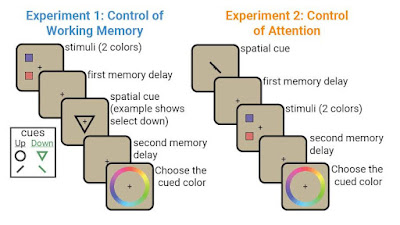 اكتشف باحثو علم الأعصاب في جامعة برينستون أن الانتباه والذاكرة العاملة مرتبطانارتباطًا وثيقًا أكثر مما أدركه معظم باحثو علم الإدراك الحديث. لقد أجروا تجربتين حيثعُرض على قردين مربعات ملونة وعلامة توجههما للنظر إلى الجزء العلوي «دائرة أو خطمائل لأعلى» أو الجزء السفلي «مثلث أو خط مائل لأسفل». ثم قام القزدان بمطابقة اللونالمحدد مع مكان نفس اللون على قرص ألوان. في التجربة الأولى «على اليسار»، رأياالقردان المربعات أولاً ثم العلامة الاتجاهية. في التجربة الثانية «على اليمين»، رأياالعلامة الاتجاهية أولاً ثم المربعات الملونة.