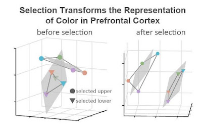بيانات من التجربة الأولى: طيف الألوان الممكنة للمربعات «العلوية والسفلية» ممثلة كحلقةفي نشاط الخلايا العصبية في قشرة الفص ما قبل الجبهية. عندما يتذكر القرد كلا الشيئين «قبل اختيار الهدف»، فإن هذه الحلقات تقع على ”مستويات“ منفصلة داخل الدماغ. هذه المستويات متعامدة مع بعضها البعض لإبقاء الأشياء منفصلة عن بعض. عند اختيار أحد الأشياء، تستدير حلقات اللون لمحاذاة لون أي من الشيئين. يسمح هذاللدماغ ”بقراءة / تسجيل“ لون الشيء المختار، بغض النظر عما إذا كان الأصل هوالشيء العلوي أو السفلي.