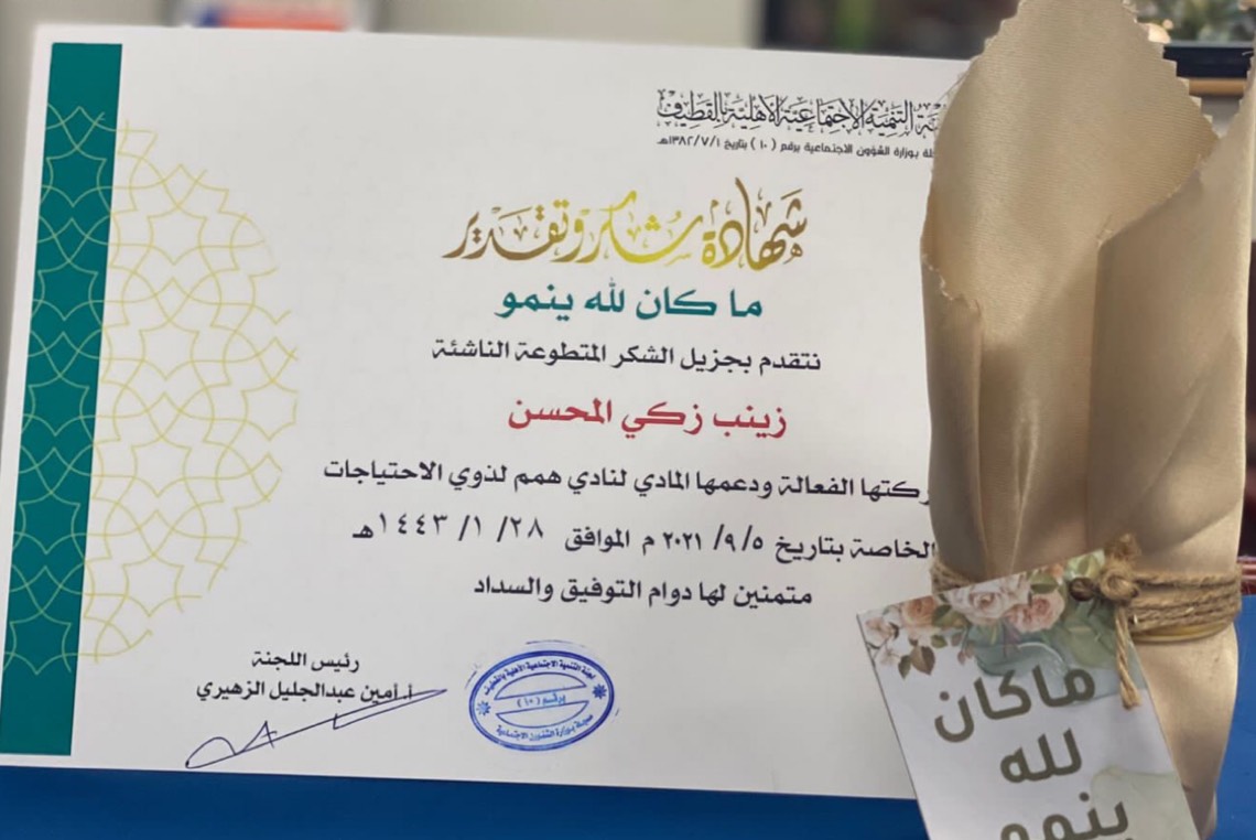 كرمت لجنة التنمية الاجتماعية الأهلية بالقطيف الطفلة زينب زكي المحسن، باعتبارها اصغر متطوعة في العام 2021.