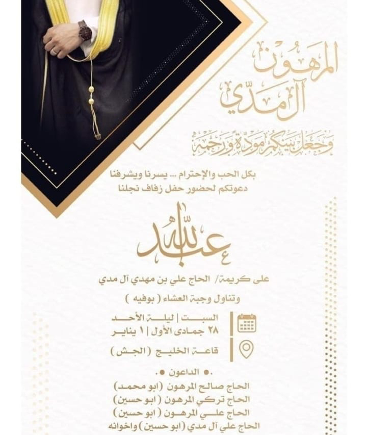 تحتفل عائلة المرهون والمدي في الجش مساء يوم السبت بزفاف الشاب عبدالله صالح المرهون على كريمة الحاج علي مهدي المدي في قاعة الخليج بالجش وسط فرحة الأهل والأصدقاء ومحبي العريسين.