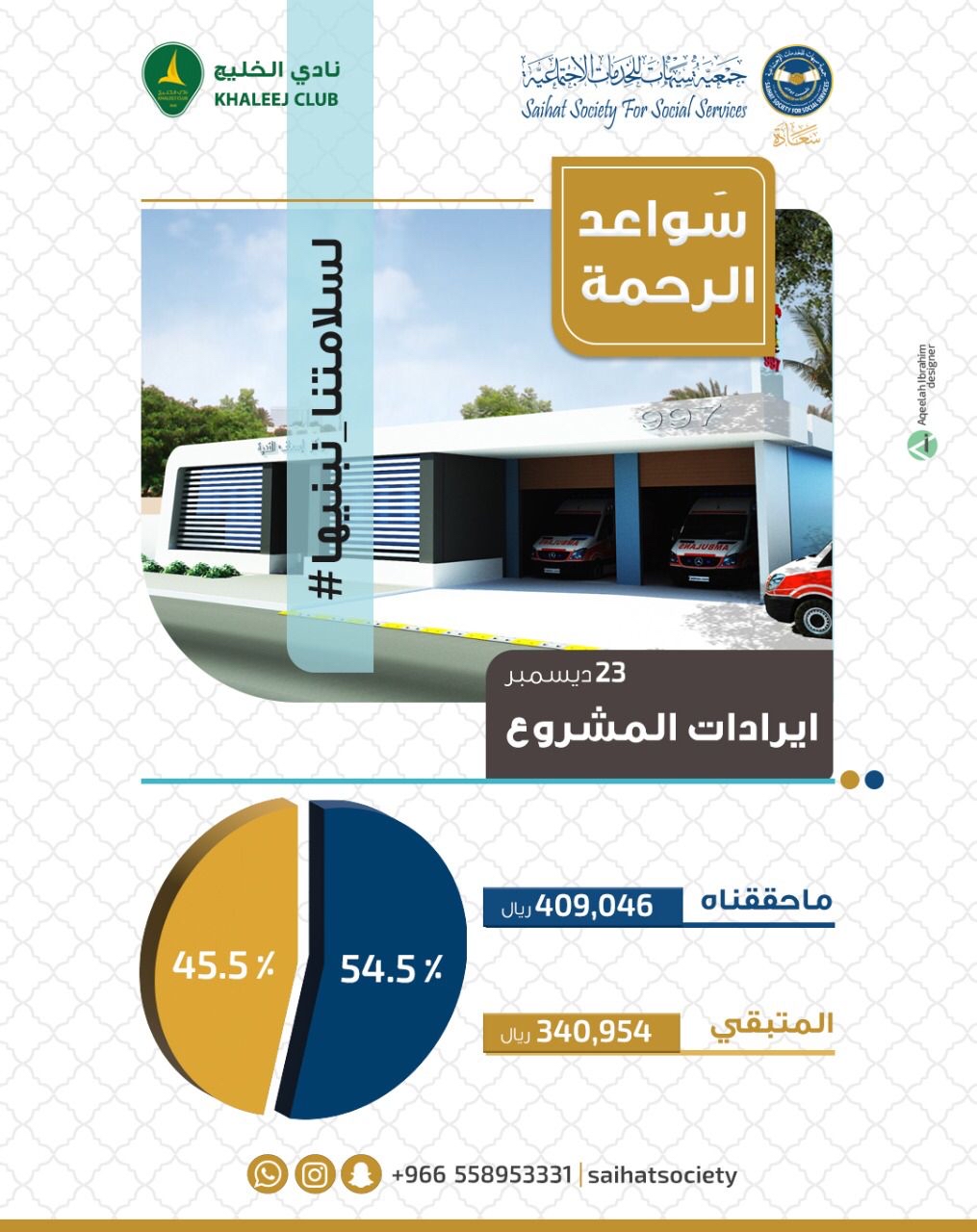 بلغت نسبة الإيرادات لمشروع ”سواعد الرحمة“ 54,5%، حيث حقق المشروع نحو 409,046 ريال خلال اسبوعين، فيما تبقى إلى الآن 340,954 ريال لتغطية كامل المبلغ المقدر ب 750,000 ريال.