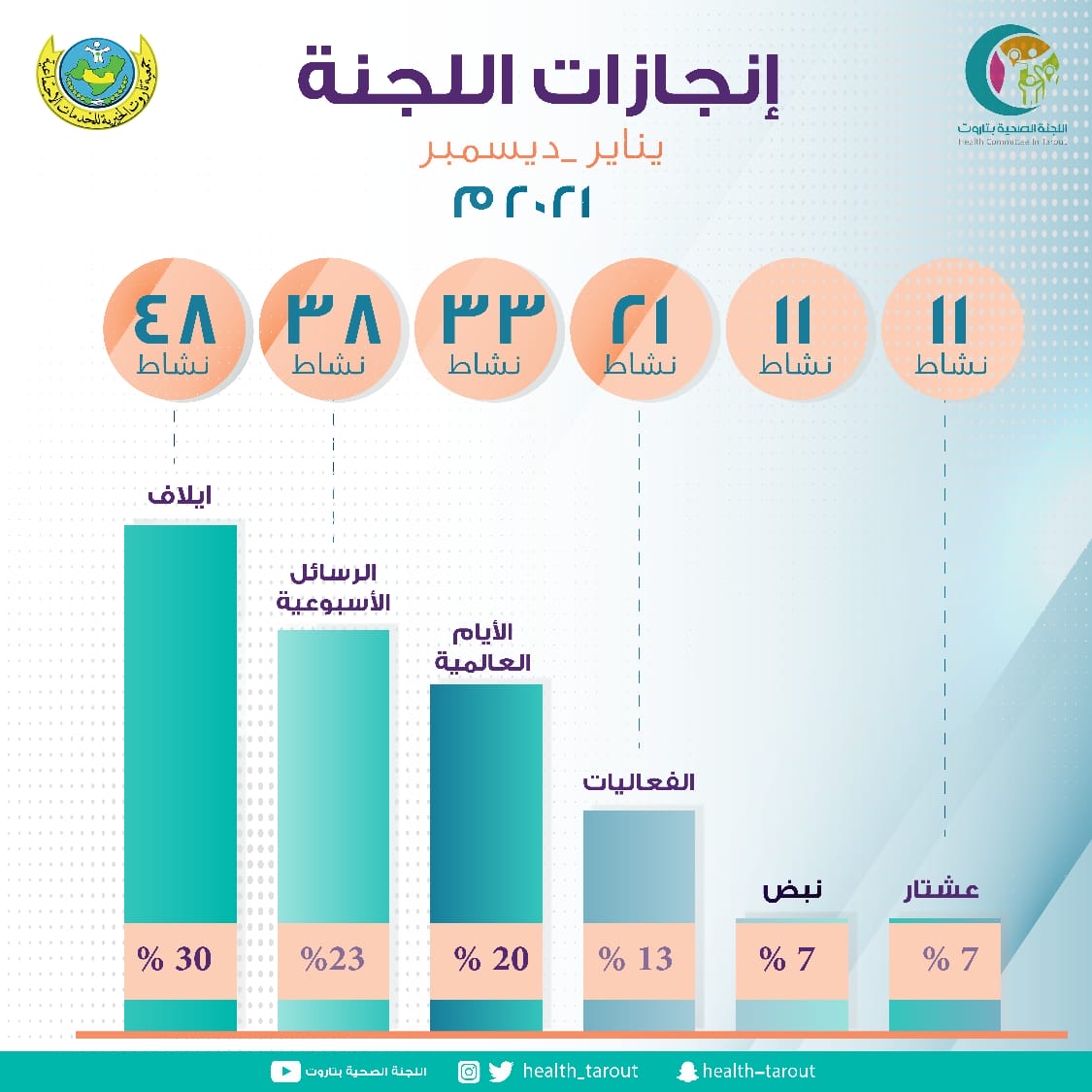 وبلغَ عددُ الإنجازات لجميعِ البرامجِ في اللجنة الصحية بجمعية تاروت الخيريةِ للعام المنصرم 162 إنجازًا، أي بزيادة نحو 22 إنجازًا عن العام السابق 2020م.