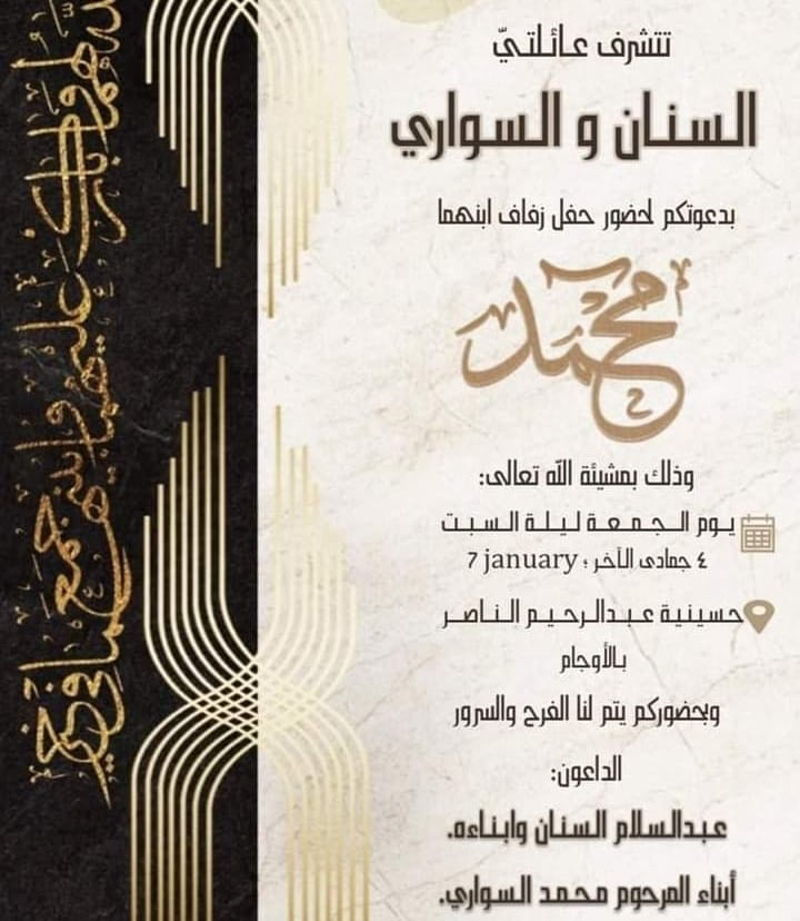 تحتفل عائلة السنان والسواري في الأوجام مساء يوم الجمعة بزفاف الشاب محمد عبد السلام السنان على كريمة المرحوم محمد السواري في حسينية عبد الرحيم الناصر بالأوجام وسط فرحة الأهل والأصدقاء ومحبي العريسين.