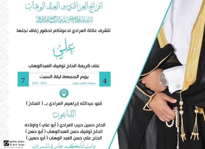 تحتفل عائلة العرادي والعبد الوهاب في تاروت مساء يوم الجمعة بزفاف الشاب علي حسين حبيب العرادي على كريمة الحاج توفيق حسن العبد الوهاب في قبو الحاج عبدالله ابراهيم العرادي بحي المناخ وسط فرحة الأهل والأصدقاء ومحبي العريسين.
