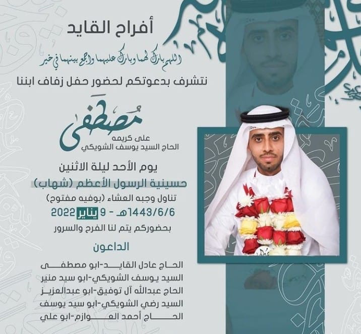 تحتفل عائلة القايد والشويكي في القديح مساء يوم الأحد بزفاف الشاب مصطفى عادل القايد على كريمة السيد يوسف الشويكي «أبو السيد منير» في حسينية الرسول الأعظم «شهاب» وسط فرحة الأهل والأصدقاء ومحبي العريسين.