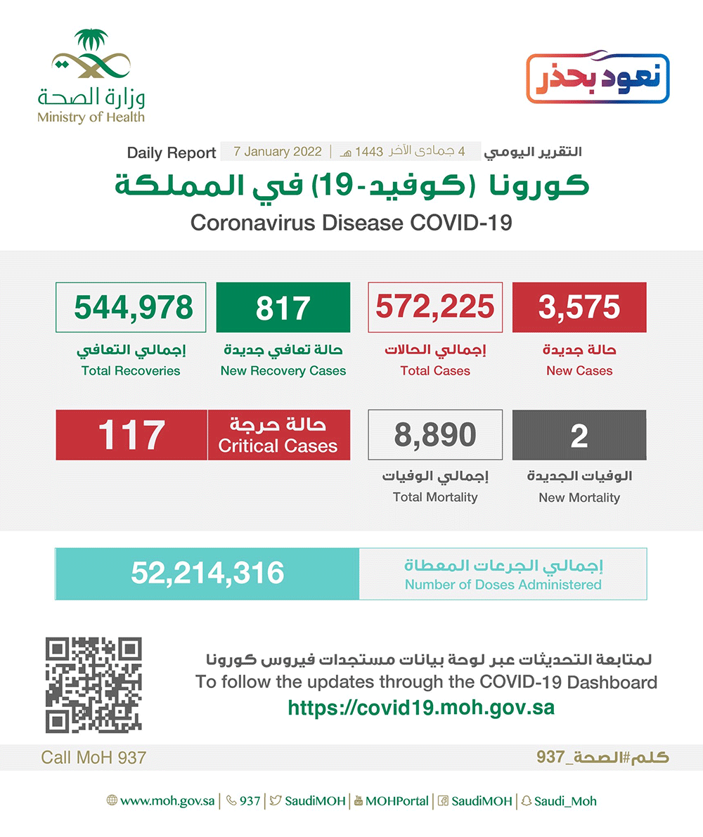 كما أعلنت الصحة عن تسجيل ”817“ حالة تماثلت للشفاء، ليصل مجموع المتعافين إلى ”544978“ حالة تعافي، فيما ارتفع إجمالي الوفيات في المملكة إلى ”8890“ حالة بعد تسجيل ”2“ حالة وفاة جديدة.