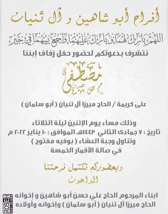 تحتفل عائلة أبو شاهين وآل ثنيان في القديح مساء يوم الإثنين بزفاف الشاب مصطفى علي حسن أبو شاهين على كريمة الحاج ميرزا آل ثنيان «أبو سلمان» في صالة الأقمار الخمسة وسط فرحة الأهل والأصدقاء ومحبي العريسين.