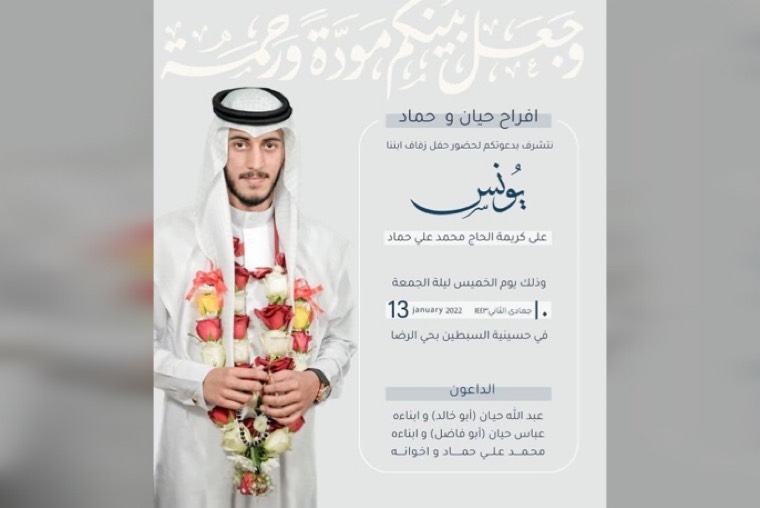 تحتفل عائلة حيان وحماد في تاروت مساء يوم الخميس بزفاف الشاب يونس عبدالله حيان على كريمة الحاج محمد علي حماد في حسينية السبطين بحي الرضا وسط فرحة الأهل والأصدقاء ومحبي العريسين.