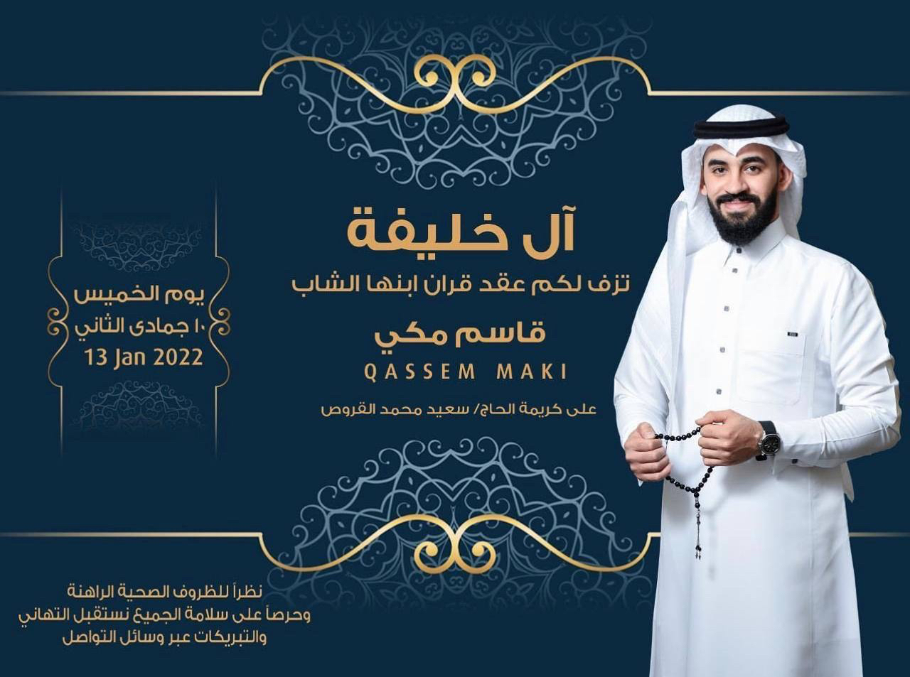 تحتفل عائلة آل خليفة والقروص مساء يوم الخميس بزفاف الشاب قاسم مكي آل خليفة على كريمة الحاج سعيد محمد القروص وسط فرحة الأهل والأصدقاء ومحبي العريسين.