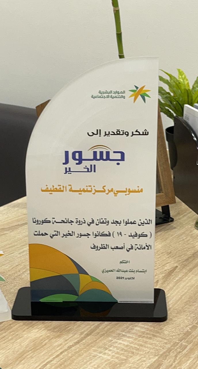 وفي ختام الزيارة كرمت الحميزي، مركز التنمية الاجتماعية بمحافظة القطيف بدرع تقديري؛ لجهوده في ظل جائحة كورونا، وما قدمه ضمن مبادرة ”جسور الخير“، والتي توثق جهود الفروع والمراكز واستمراريتهم في العمل.