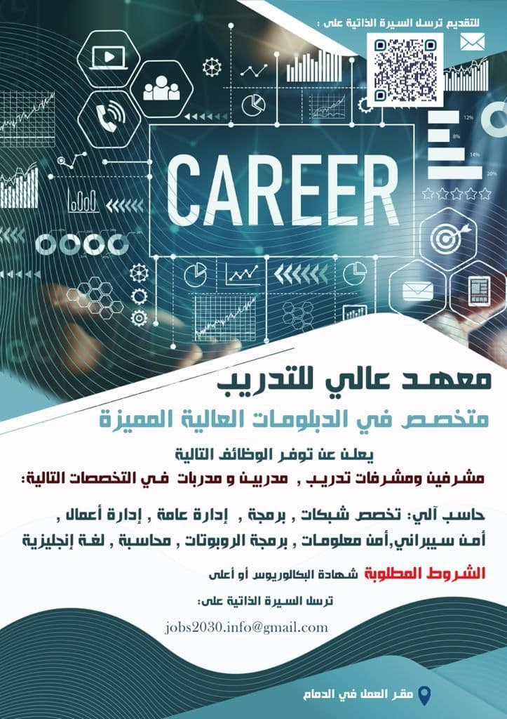 أعلن معهد تدريب متخصص في الدبلومات العالية بالدمام بفرعيه «الرجال - السيدات» عن توفر وظائف شاغرة لمشرفين ومشرفات تدريب، مدربين ومدربات حسب المؤهلات التالية: