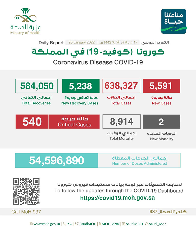 كما أعلنت الصحة عن تسجيل ”5238“ حالة تماثلت للشفاء، ليصل مجموع المتعافين إلى ”584050“ حالة تعافي، فيما ارتفع إجمالي الوفيات في المملكة إلى ”8914“ حالة بعد تسجيل ”2“ حالة وفاة جديدة.
