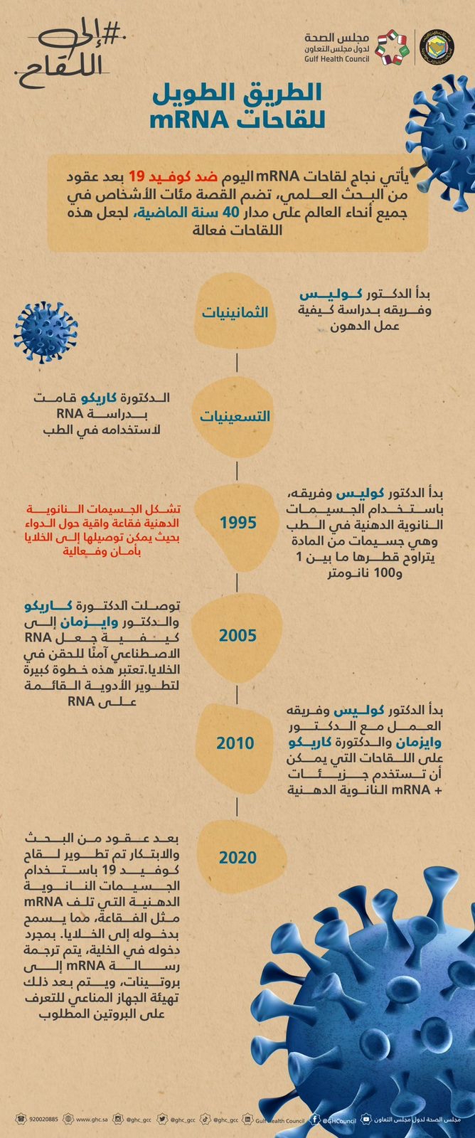 نشر مجلس الصحة الخليجي عبر حساباته في وسائل التواصل الاجتماعي ”إنفوجرافيك“، يحكي القصة الطويلة لاختراع لقاحات تعتمد على طريقة mRNA.