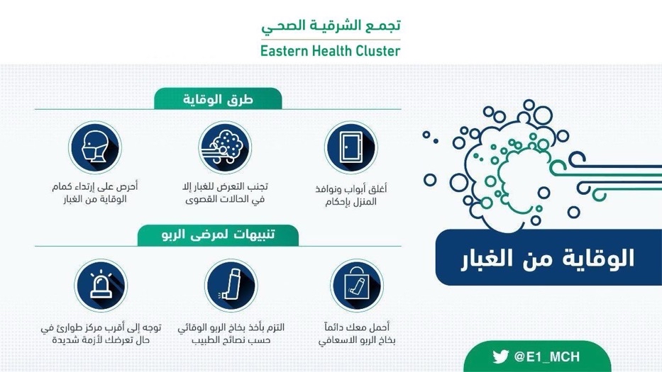 وحذر تجمع الشرقية الاول، الجميع، من خطورة الخروج أثناء التقلبات الجوية بسبب موجة الغبار التي شهدتها المنطقة صباح اليوم الجمعة، إلا للأعمال الضرورية.