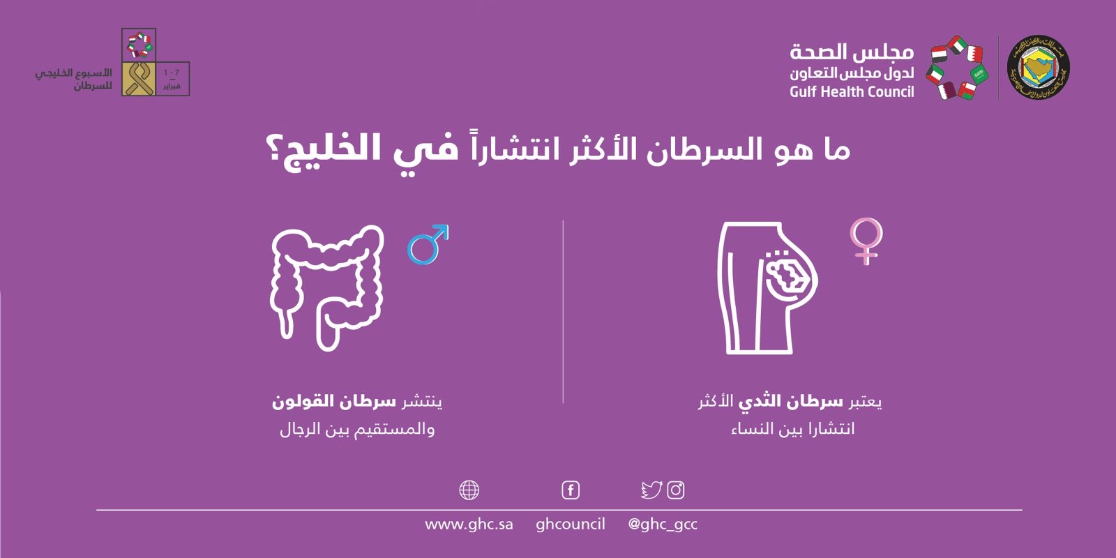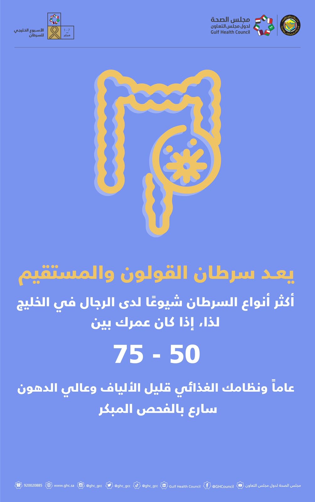 وذكر مجلس الصحة الخليجي أن سرطان القولون والمستقيم هي الأكثر شيوعاً لدى الرجال في الخليج، وشدد على من أعمارهم مابين 50 و75 سنه ونظامهم الغذائي قليل الالياف وعالي الدهون المسارعة في الفحص المبكر للتأكد من حالته الصحة.