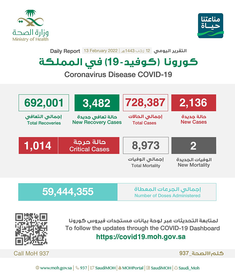 «الصحة»: تسجيل 2136 إصابة جديدة ب «كورونا».. ”19“ بالقطيف و”11“ بصفوى و”1“ بسيهات