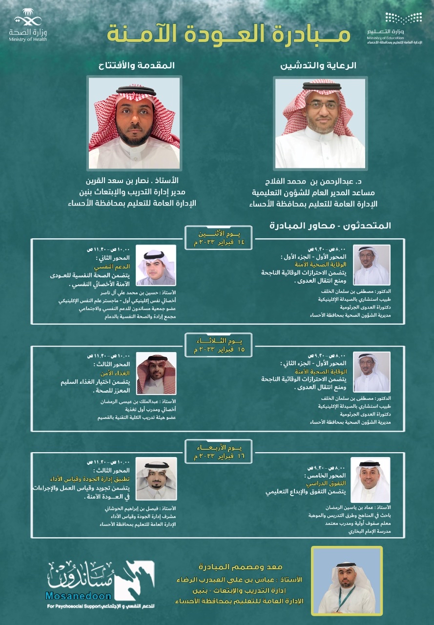 أطلقت الإدارة العامة للتعليم بمحافظة الأحساء ممثلة في إدارة التدريب والابتعاث - بنين - مبادرة ”العودة الآمنة“، برعاية مساعد مدير عام التعليم للشؤون التعليمية الدكتور عبدالرحمن الفلاح، وذلك خلال الفترة من ”الإثنين - الأربعاء“، 13- 15 رجب الجاري.
