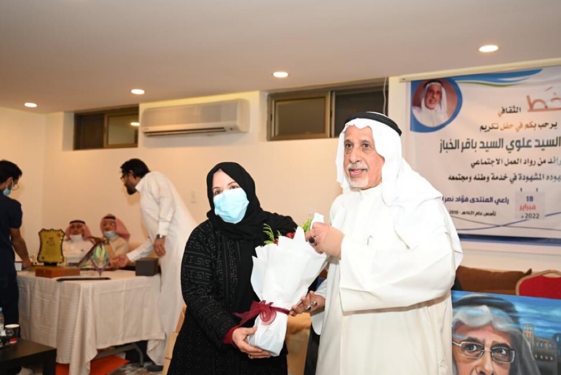 ثم تعاقب على الحديث عن المحتفى به كل من الفنانة التشكيلية حميدة السنان، ونجاح العمران وخضراء المبارك، وكل منهن أشادت بخدمات السيد الخباز في مجال ما من المجالات التي كان مشرفا عليها ومتابعا لها.
