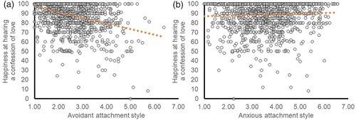 الذين لديهم أنماط تجنب التعلق [2] هم أقل سعادة عند سماع شريك حياتهم يصرح بعبارة ”إني أحبك“ من الأشخاص غير المتجنبين للتعلق «الرسم البياني على اليسار». الذين لديهم أنماط شغف التعلق يكونون أكثر سعادة عند سماع شريك حياتهم يصرح بعبارة ”إني أحبك“ أكثر من الأشخاص غير الشغوفين لذلك التصريح «الرسم الباني على اليمين».