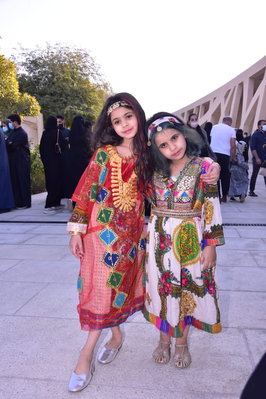 وظهر الزائرون على جنبات العرض من كبار وصغار بأزياء عائدة للمناطق بين العقال والدقلة من الوسطى ومعهم نساء بالبرقع و”الشيلة“ وأطفال ب ”البخنق“ فيما ارتدت فتيات وسيّدات من الشمال لباس ”المحوثل“، بينما كان هناك جموع ب ”الصمادة“ من الذكور وب ”السدرة“ من الإناث رمزاً للمنطقة الجنوبية، وارتدى أهالي الشرقية ”البشت“ للرجال و”النشل“ للنساء.